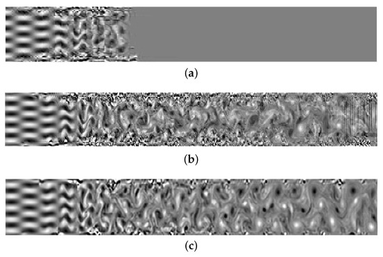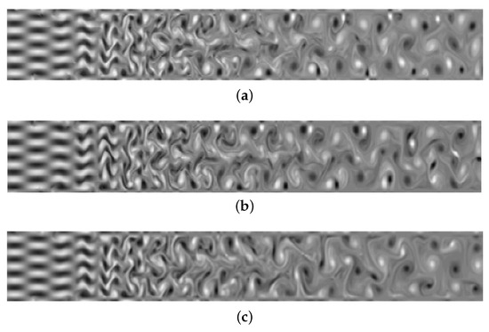 Figure 2 and Figure 3 compare the stability and resolution of several high-order schemes as evaluated by the vorticity of the flow field. Figure 3a shows the vorticity distribution before the collapse of the DGSEM-LGL scheme when t = 23.6, and Figure 3b,c show the vorticity distributions are calculated statically with high-entropy stability under different node configurations. The LLF numerical flux produces spurious reflections near the outflow boundary, and the entropy-stable strategy has an effect in suppressing the instability. Moreover, Figure 3b,c also show that the entropy-stable strategy based on the LG solution points has good robustness and resolution.