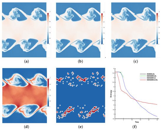 Figure 4 shows the different performances of the four high-order schemes for calculating instability problems, where the computational time of Figure 4a–d is 3.7 and the computational termination time of Figure 4f is 25. As seen from the comparison of Figure 4a–c, the high-order scheme using the entropy-stable strategy is more robust than the traditional high-order scheme, and the high-order entropy-stabilization strategy based on subcell limiting performs better in suppressing oscillations. Figure 4f mainly describes the evolution process of the total entropy of the four schemes till t = 25.0. Among the schemes, the DGSEM-LGL and ESDGSEM-LGL schemes exhibit computational collapse due to the absence of the stability strategy, whereas the other schemes satisfy the second law of thermodynamics.