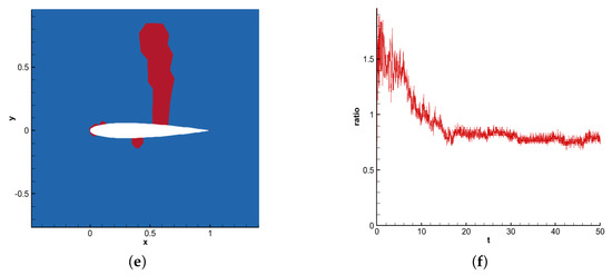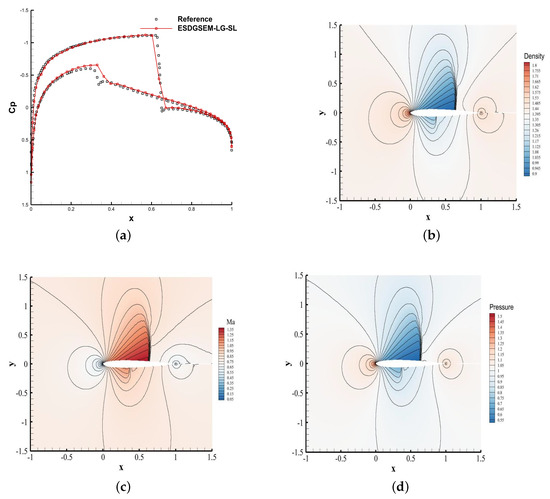 As shown in Figure 6, the ESDGSEM-LG-SL scheme is used to simulate the airfoil problem, and the density, pressure, Mach number, surface pressure coefficient and troubled cell distribution are obtained. Figure 6e,f show that the scheme correctly identifies the troubled cells. The contour results of Figure 6b–d show that the shock waves on the upper and lower surfaces of the wing are well captured. As shown in Figure 6a, the pressure coefficients of the upper and lower surfaces exhibit less numerical oscillation near the discontinuity point. Therefore, the scheme can predict the apparent pressure coefficient of the airfoil accurately.