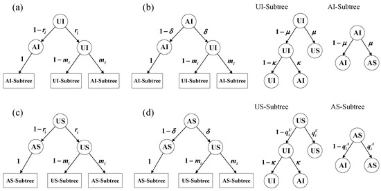 Transition probability trees for four possible node states in the coupled information–epidemic spreading model with selective mass media. Subfigures (a–d) represent the transition probability trees of different node states UI, AI, US and AS, respectively. The roots of the trees represent the possible states of each node at time t, and the leaves represent its possible states at time . Each time step can be divided into four continuous phases: information dissemination(UAU process); mass media broadcasting; self-awareness of being infected; and epidemic spreading (SIS process).