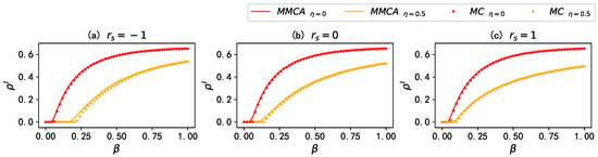 Firstly, we examine the accuracy of the MMCA theory framework in predicting the stationary fraction of infected individuals, . Figure 3 compares the fraction of obtained through the MMCA theory and MC simulations under different scenarios. It can be seen that, in the multiplex networks with various inter-layer degree correlations , the MMCA theory accurately predicts the stationary fraction of infected individuals for the entire range of the considered infection rate . Furthermore, by comparing the results with and without mass media propagation, the MMCA method accurately predicts the role of mass media in suppressing disease spreading.