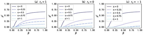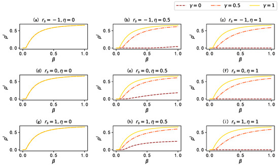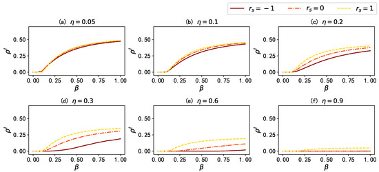 Furthermore, we also investigate the impact of varying the mass media broadcast proportion on the stationary fraction of infected individuals , when . As shown in Figure 5, in networks with different inter-layer degree correlations, increasing the value of can effectively reduce .