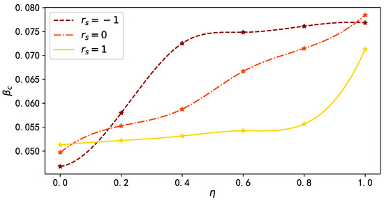 As shown in Figure 8, when , as the proportion of mass media broadcast proportion increases, the epidemic threshold rises rapidly, while for , it takes a larger value of for to show a significant increase.