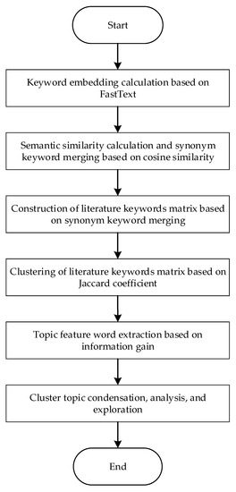 There are some limitations to this study. In the future, the use of dynamic word vector models will be explored. Compared with the static word vector model of FastText, the dynamic word vector model, such as a pre-trained deep learning model, can make fuller use of contextual information. Therefore, it can characterize the meaning and semantic relationships of keywords more accurately, leading to the higher accuracy of the keyword merging process. Furthermore, deep neural network learning algorithms, such as the sentence vector model, will be explored to learn topic features from text and add topic information with global features to word vectors, which can improve the concentration of topic identification and clustering.
