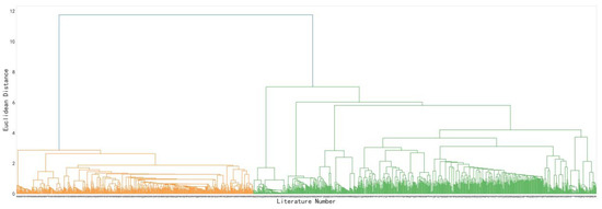 The Jaccard coefficients between the literatures were calculated based on the literature keywords matrix shown in Table 3, and the literature topics were clustered using the hierarchical clustering method. The hierarchical clustering tree diagram is shown in Figure 3.