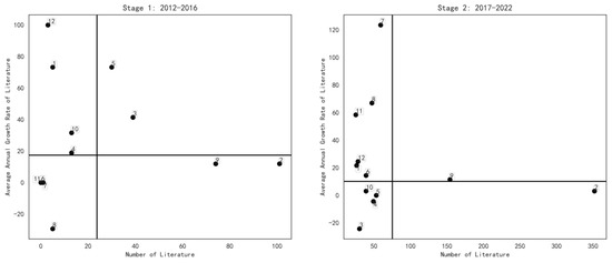 On the basis of the two time periods, the subject distribution matrices for the two time periods were constructed based on the two dimensions of subject literature volume and average annual growth rate of the literature with reference to the Boston Consulting Group Matrix (BCG Matrix) idea. The two time intervals used in calculating the cumulative literature volume and the average annual growth rate of literature for each theme were 2012 to 2016 and 2017 to 2022, respectively. In each stage, the threshold value for the volume of literature was set as the volume of literature in a balanced state of development for each topic, i.e., the total volume of literature divided by the number of topics in that stage, and the threshold value for the volume of literature was calculated. In addition, the threshold value for the average annual growth rate of literature was set as the average annual growth rate of the total literature of each topic in that stage. The calculation results are shown in Table 7.