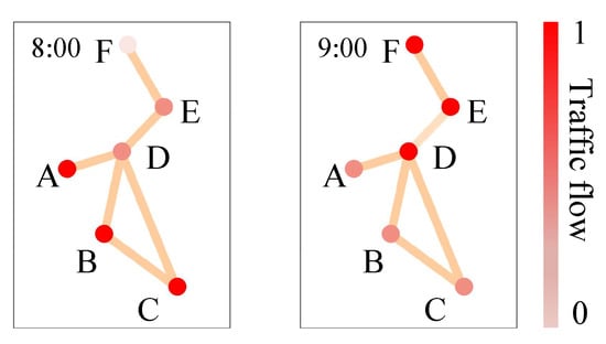 Figure 1 shows the traffic flow network map at 8:00 and 9:00, respectively. The darker the color of the node, the higher the flow at that node. The traffic flow of nodes D, E, and F will be affected by nodes A, B, and C at previous moments. In other words, the traffic flow of each node is interrelated with other neighboring nodes [19]. When predicting the traffic flow of one node, the traffic flows of other nodes can also be properly input into the model. In addition, the traffic flow is also highly nonlinear and periodic [20], which makes it more difficult to predict. The traffic flow of the traffic road network is very dynamic in the temporal and spatial aspects, so it is a very challenging task to predict the traffic flow data accurately.