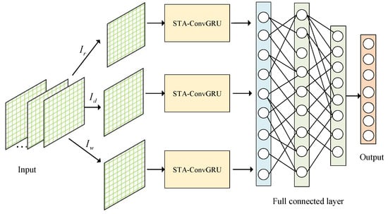 Motivated by the above research, we model traffic data using convolutional neural networks, gated recurrent units, attention mechanisms, and multiple input strategies considering the spatial–temporal dynamic correlation and periodicity of traffic flow data.