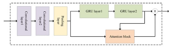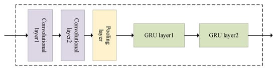 The ConvGRU module consists of CNN and GRU, where the convolutional kernel sliding operation of CNN captures the spatial correlation of traffic flow at a fine granularity, and the special gating unit mechanism in GRU efficiently extracts the temporal dependence of traffic flow. The combination of CNN and GRU in the ConvGRU module is shown in Figure 4. The CNN contains two convolutional layers and one pooling layer, which is due to the complex spatial characteristics of the traffic road network and the limited expression capability of the single-layer convolutional kernel, so two layers of convolutional layer 1 and convolutional layer 2 are used to extract more comprehensive spatial correlation, followed by filtering unnecessary information as well as reducing the dimensionality of the input data through the pooling layer; finally, the output of the CNN pooling layer is used as the input of GRU, and the output value of the module is obtained after two layers of GRU.