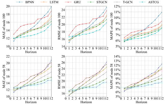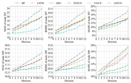 To visually compare the prediction performance of the four models, Figure 10 and Figure 11 display the prediction evaluation metrics at node 307 of the PEMS04 dataset and node 100 of the PEMS08 dataset. It is evident from the visualizations that ASTCG consistently achieves the best prediction results for all four evaluation metrics at different prediction time steps, showcasing the superior performance of this model.