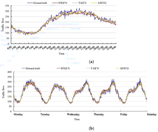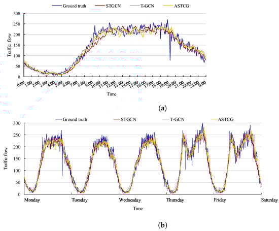 Traffic flow visualization of three spatial–temporal prediction models on the PEMS04 dataset. (a) One-day traffic flow visualization at node 104; (b) One-week traffic flow visualization at node 104.