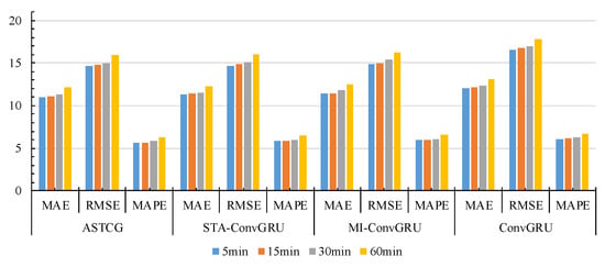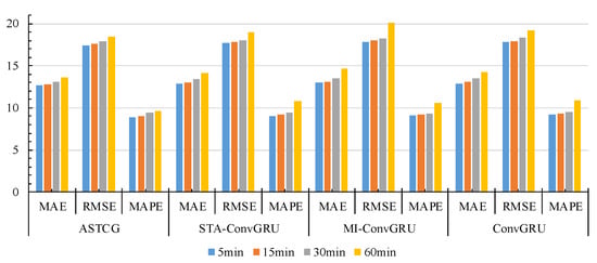 The experimental results show that the prediction performance of all four models declines as the length of the prediction time step increases on both datasets. This is mainly attributed to the reduced knowledge that the models can glean from historical traffic flow data when predicting larger time steps, resulting in decreased prediction accuracy. Additionally, it can be observed that the STA-ConvGRU and MI-ConvGRU models outperform the ConvGRU model in terms of prediction performance. This is reasonable, as the STA-ConvGRU and MI-ConvGRU models incorporate different temporal dependency extraction components, which enable them to capture richer time-related information. This finding further validates the effectiveness of the proposed multi-input component and attention mechanism component. Among the four models, the ASTCG model exhibits the best prediction performance. For instance, in the 60 min prediction task at node 100 of the PEMS08 dataset, the MAE value of ASTCG is reduced by 2.72% compared to MI-ConvGRU, and the MAPE value is reduced by 2.80% compared to STA-ConvGRU. This indicates that the inclusion of the feature extraction component in the model effectively enhances the prediction accuracy. Moreover, the ASTCG model demonstrates accurate predictions of traffic flow at four different nodes in the two datasets, showcasing its excellent generalization ability.