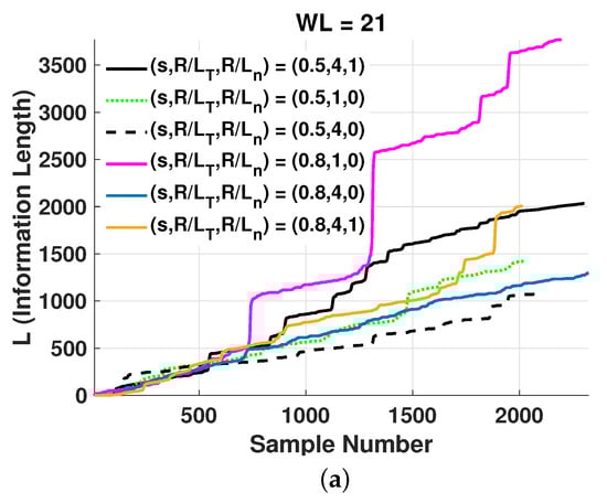 Information length (L) as a function of time samples, where running windows of samples have been used with different lengths (a) for , (b) for , and (c) for .