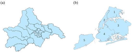 Our research team collaborated with the local government in Chengdu, China, to address traffic congestion issues. As part of this effort, we obtained a dataset containing the trajectories of 10,037 authorized taxis belonging to a specific taxi company in Chengdu. Each taxi’s recording interval in the original dataset was 10 s, with each data item containing anonymized vehicle ID, timestamp, latitude, longitude, and occupancy flag (1 or 0). The dataset covers a time period from 1 August to 30 August 2014, with latitude and longitude recorded at meter-level accuracy. The occupancy flag, a Boolean variable, indicates whether a taxi was occupied (with passengers) or unoccupied (without passengers) at the recorded time. Furthermore, we gathered data of approximately 12 million taxi trajectories from New York City, United States, spanning from 1 March to 30 March 2016. Each row of the taxi trajectory data contains information on time, distance, latitude, and longitude. Finally, we obtained the GIS data necessary to construct and analyze the Chengdu and NYC administrative map.