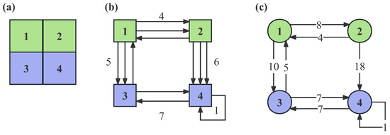 In Figure 2b, the taxi trajectories have starting and ending positions located in different cells according to their respective latitude and longitude. The directed edges in the network represent the directions of the taxi trajectories. Figure 2c displays the resulting trip network, where the weight of the edges between cells i and j is set to if there are n trajectories from cell i to cell j, with each edge having a length of d. Additionally, if the starting and ending positions are located in the same cell, a self-loop will be created for that cell.