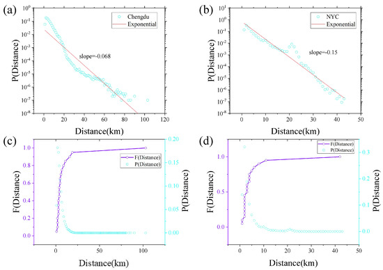 (a,b) The linear–logarithmic plot of the distance probability density distribution of the Chengdu and NYC trip network. The horizontal axis is the distance, and the vertical axis is the corresponding probability. The red line indicates the results of fitting the probability density distribution. (c,d) the linear–linear plots of the cumulative distribution for the Chengdu and NYC trip network.
