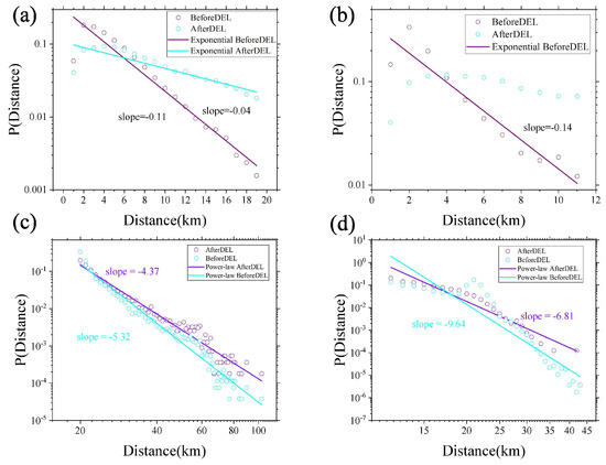(a,b) The linear–logarithmic plots of the distance probability density distribution of the Chengdu and NYC short-distance trip network, respectively. The horizontal axis is the trip distance. The vertical axis is the corresponding probability. The results of fitting the probability density distribution are the colourful lines. (c,d) the logarithmic–logarithmic plots of the distance probability density distribution of the Chengdu and NYC long-distance trip networks, respectively. The horizontal axis is the trip distance. The vertical axis is the corresponding probability. The results of fitting the probability density distribution are the coloured lines.