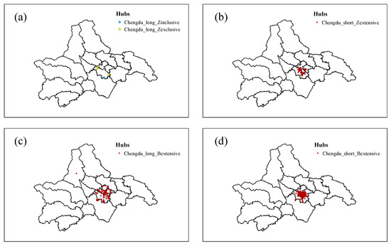 Distribution of hub nodes in Chengdu long- and short-distance trip network. (a) Distribution of internal inclusive hubs (Chengdu_long_Zinclusive) and internal exclusive hubs (Chengdu_long_Zexclusive) in the Chengdu long-distance trip network. (b) Distribution of internal extensive hubs (Chengdu_short_Zextensive) in the Chengdu short-distance trip network. (c) Distribution of external extensive hubs (Chengdu_long_Bextensive) in the Chengdu long-distance trip network. (d) Distribution of external extensive hubs (Chengdu_short_Bextensive) in the Chengdu short-distance trip network.