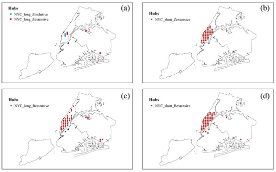 Distribution of hub nodes in NYC long- and short-distance trip network. (a) Distribution of internal inclusive hubs (NYC_long_Zinclusive) and internal extensive hubs (NYC_long_Zextensive) in the NYC long-distance trip network. (b) Distribution of internal extensive hubs (NYC_short_Zextensive) in the NYC short-distance trip network. (c) Distribution of external extensive hubs (NYC_long_Bextensive) in the NYC long-distance trip network. (d) Distribution of external extensive hubs (NYC_short_Bextensive) in the NYC short-distance trip network.