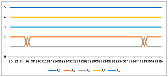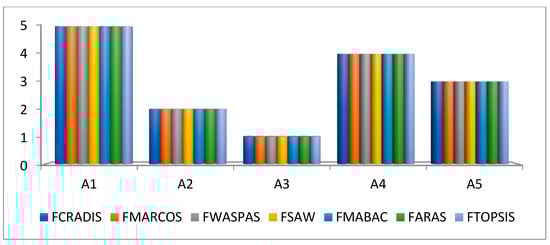 Validation of the results was performed using the same decision matrix and the same criterion weights, but the ranking order was established using different fuzzy methods [40,41,42,43]. In this study, the following fuzzy methods were used: fuzzy MARCOS (measurement of alternatives and ranking according to a compromise solution), fuzzy WASPAS (weighted aggregates’ sum product assessment), fuzzy SAW (simple additive weighting), fuzzy MABAC (multi-attributive border approximation area comparison), fuzzy ARAS (additive ratio assessment), and fuzzy TOPSIS. Each of these methods has its specific steps and ranks the alternatives in a different way. This is one of the reasons why this analysis has been performed. By using different fuzzy methods, it is possible to refute the results and prove that fuzzy CRADIS is not an adequate method for solving this research problem [44].