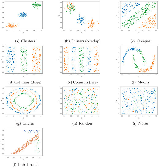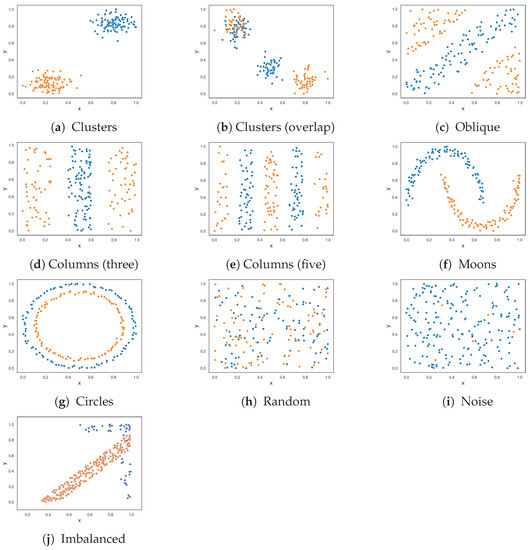As for the F2 measure, F3 has a computational cost of , and it returns values in [0,1]. F3 also uses the minimum and maximum values of a feature for different classes in its calculation of complexity and therefore suffers from the same problems, namely only being able to identify one overlapping region per feature, unable to identify orthogonal hyperplanes that separate classes, and sensitivity to noise.