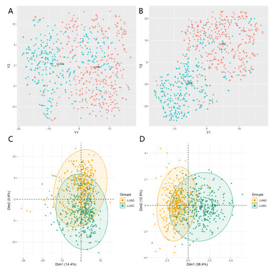 Overview of the proteome profiling across lung adenocarcinoma (LUAD) and lung squamous cell carcinoma (LUSC) samples. The subgraphs (A,B) are the results performing t-SNE; the subgraphs (C,D) are the results performing PCA; (A) t-SNE and (C) PCA showed the clusters of samples based on whole proteome profiling; (B) t-SNE and (D) PCA showed the clusters of samples based on the top 10 selected protein profiling.
