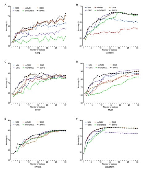 Considering that the above six feature selection algorithms are all based on a feature ranking strategy, an effective method for further comparing their classification accuracies is to individually add features for learning. We employed this strategy using a range of 1–30 selected features. Figure 2 shows the comparative results based on six representative datasets (Lung, Madelon, Sonar, Musk, Krvskp and Waveform). For each subgraph, the x-axis refers to the first selected features, and the y-axis represents the average classification accuracy of three classifiers for the top selected features. In Figure 2, it is obvious that the proposed WBFS method shows better average accuracies than the others in most cases based on the Lung, Madelon, Sonar, and Musk datasets. For instance, WBFS obtains the highest average classification accuracy of 76.39% with only seven features, while accuracies of 68.50%, 67.44%, 70.40%, 74.31%, and 64.84% are achieved by MIM, mRMR, DISR, CIFE and CONDRED, respectively, with the same number of selected features. For Krvskp and Waveform, the accuracies of each method are comparable because their ratio value is sufficiently large; WBFS still obtains the best accuracy in most cases.