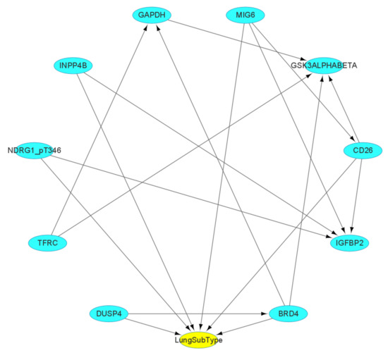 The Bayesian network (BN) for the top 10 selected signatures and class label based on lung tumor dataset. These directed arrows represent the causal relationship between every two nodes. The cyan nodes are the key factors that are critical for subtype classification, and the yellow node represents the lung subtype classification.