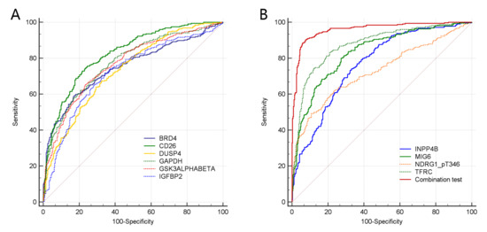 ROC curves of the 10 selected protein features and the combination test of 8 biomarkers. (A) shows the ROC curves of the 6 protein features of BRD4, CD26, DUSP4, GAPDH, GSK3ALPHABETA and IGFBP2; (B) shows the ROC curves of the 4 protein features of INPP4B, MIG6, NDRG1_pT346, TFRC and the combination test curve of 8 biomarkers.
