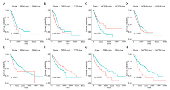 Figure 5 shows the Kaplan–Meier survival curves of the above factors, which demonstrates that MIG6, TFRC, INPP4B and IGFBP2 factors have a significant impact on the overall survival rate of LUAD patients (p < 0.05), and the MIG6, TFRC, and INPP4B factors have a significant negative prognosis correlation (p < 0.05). For LUSC patients, the factors of MIG6, GAPDH, CD26, and TFRC are all significantly correlated with the overall survival rate of patients (p < 0.05), and TFRC was the only factor that has a significant positive prognosis correlation (p < 0.05).