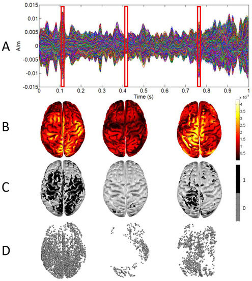 (A) Sources activity for one second. (B) 3D representation of sources activity at three different samples (red boxes). (C) 3D representation after binarization. (D) Point cloud defined by sources after binarization.