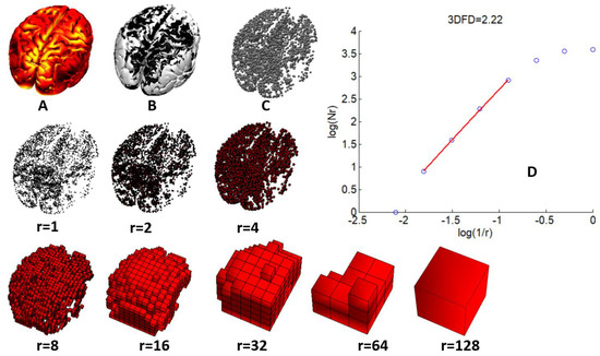 Once the 3D point clouds for all the time samples in the 120 s epoch had been computed, the epoch was divided using a sliding window of 1 s without overlapping. Then, the box-counting algorithm was used to obtain the 4DFD value for the 4D set defined in each window by putting together the 3D point clouds of the time samples for the corresponding second. In this way, a total of 120 4DFD values were obtained for each epoch. Figure 2 shows an example of the process of computing the FD of the brain activations using the box-counting algorithm. For the sake of clarity, the example shown in Figure 2 is presented in three dimensions. For the 4D case, the algorithm performed similarly with the same parameters, but having as input the 4D point clouds defined by all the 3D point clouds contained in one second.