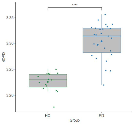 Boxplot with differences in 4DFD between the HC and PD groups. Each 4DFD value corresponds to the average of the 120 4DFD values computed for each subject, one 4DFD for each second in the epoch. p-value for Mann–Whitney U test (****: p < 0.001).