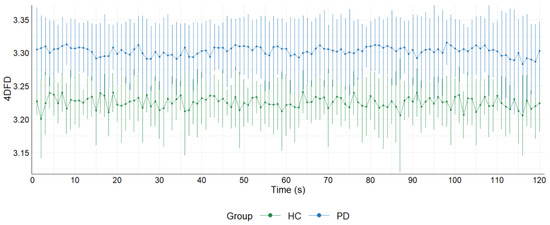 We also compared the evolution of the 4DFD for the 120 s analyzed in each epoch (see Figure 4). Each point in Figure 4 represents the average of the 4DFD values for all the subjects of the group in the corresponding second. Each point is accompanied by the error bars showing the standard deviation of the mean. Results showed that the distribution of 4DFD values over time is clearly different between groups, with higher values for the PD group (U = 14,400, p = 0.000).
