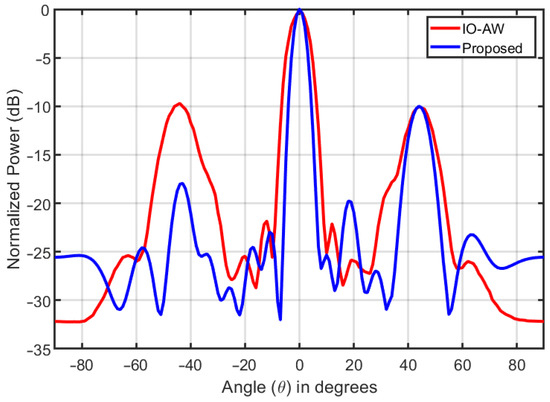 Figure 6 shows the transmit beampatterns as synthesized by the waveform matrix S designed through the proposed ADMM-based approach and that of iterative optimization with amplitude weighting (IO-AW) as reported in [46]. In both cases, the systems have 16 antenna elements, and the radar target is located at and the communication user at . Moreover, in both cases, the power of the desired radar waveform is designed to be 10 dB more than that of the communication waveform. As can be seen in the figure, the IO-AW method leaks power at or, in other words, makes a mirror lobe toward a direction where there is no communication user. Otherwise, the sidelobe levels of the two beampatterns are almost the same. Thus, the beampattern formed through the proposed method outperforms the beampattern formed through IO-AW.