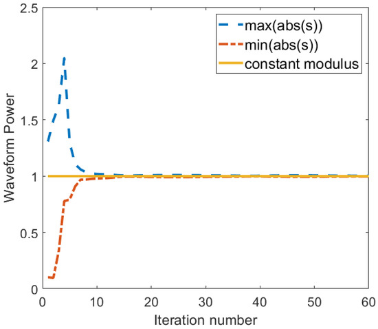 Figure 8 shows how the CM constraint is met. The plots in the figure show the maximum and the minimum modulus samples of , and the desired uni-modulus samples, at each iteration. As can be seen in the plots, the maximum and the minimum values settle at 1 at about the 10th iteration.