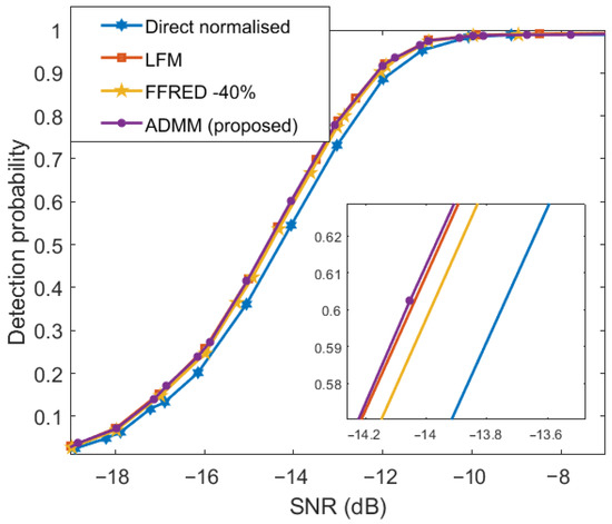 Figure 10 shows the graph of detection probability plotted against the SNR. The probability of a false alarm is set as . For comparison, the pD versus SNR graphs of other methods are also provided. As the figure shows, FFRED-40% [56] has the best pD, which is almost the same as that of the desired LFM. However, the graph of the proposed method is so close that the difference becomes visible upon zooming in on the plots. At the same time, the proposed method provides better pD than that of the directly normalized method [26].