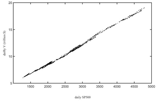 It is worth mentioning that the total (unadjusted) market value V of this set of companies at the end of the period was USD 18.9 trillion [40,41], and they represented at least 60% of the total New York Stock Exchange (NYSE) market cap in the period 2000–2021 [46]. Hence, as expected, V is strongly correlated with the S&P 500 index, as shown in Figure 1. This simply confirms that V for the selected set of companies serves as an aggregate measure of production to determine the business cycle chronology (working with the entire set of 2800 NYSE listed firms would be a daunting task).