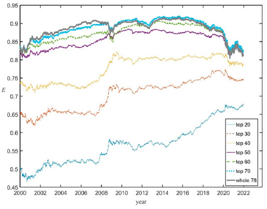 As an additional check that that E(t), given by Equation (4), correctly reflects the market evenness of the whole U.S. stock market the Shannon evenness was computed through Equation (3) but taking subsets of the whole set of 78 firms, i.e., the top 20 companies, the top 30, etc. (and replacing in Equation (3) 78 by N = 20, 30, etc.). Figure 2 shows that the corresponding succession of curves of EN (t) converges towards the evenness E(t) for the whole set; for N ≥ 50 the curves are qualitatively very similar, while the curve E70 (t) only shows small departures from E(t). This is because adding companies with very low shares does not change much E since xi ln xi → 0 when xi → 0.