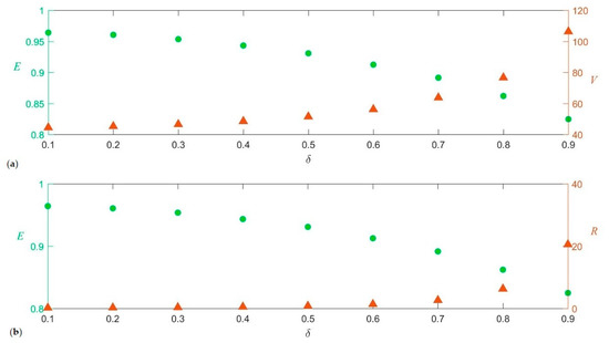 For each value of δ the corresponding E, R and V were obtained as averages over 1000 simulations of synthetic communities, defined by the interaction matrix of Equation (6), starting with the initial random configuration of Equation (7). (a): Curves of vs. δ (circles, left axis) and vs. δ (triangles, right axis). (b): Curves of vs. δ (circles, left axis) and vs. δ (triangles, right axis).
