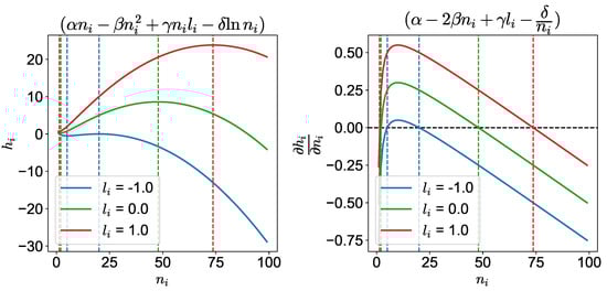 Effective utility and its derivative as a function of the number of neighbors, , for different values of alignment (). There are two points where the derivative of the effective utility is zero for different alignments.