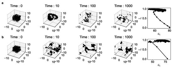 Figure 2 shows the snapshots at different time points of the evolution in 3D space and the phase space. While the exact dynamics, the exact configuration of the population, and the time scale of evolution of these two models cannot be the same (and that is not the aim, either), we observe that the qualitative patterns of collective behavior are very similar in both cases. In particular, we see that all agents gravitate toward a certain region in the phase space for both models. They both start at the lower far right point (where the average alignment is near zero as the agents are all randomly oriented initially and closely packed) and evolve toward the upper center-right region in black. We notice a qualitative match of both trajectories.