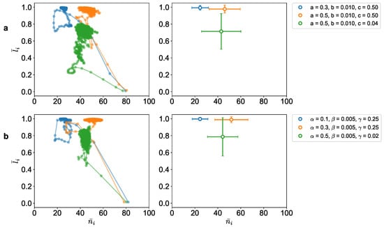 Furthermore, we can also see a quantitative similarity between the two models for specific parameters (Figure 3). Figure 3a shows the phase space for the Reynolds model, and Figure 3b shows the same for the utility-driven model. In both models, we notice similar features of evolution toward the arbitrage equilibrium states, starting from the lower right point at time to ending in the colored regions, where the average number of neighbors and the average alignment fall in similar corresponding regions. The plots on the right show the average alignment and average number of neighbors of the agents in the last 100 time-steps.