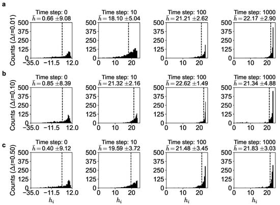 We also ran the simulations for different time-step sizes of in Equation (11) to understand the dynamics of the evolution better. Note in Figure 4 that at the start (), the utilities of all the agents are spread out, with many having negative utility values and the average utility being () low. However, as the dynamics evolves, every agent tries to increase its utility by maneuvering to a better neighborhood and better orientation, the distribution becomes narrower, the average utility keeps increasing, and it reaches a near-maximum value ( in Figure 4a) and fluctuates around it. Note that this is around the maximum theoretical value of about 23.8 (given by Equation (10)), where the histogram peaks. This suggests that nearly all the agents have similar effective utilities asymptotically, approaching the maximum. This, of course, is the arbitrage equilibrium outcome predicted by the theory (see also Supplementary information, Figure S3). The agents do not converge exactly on but fluctuate around it because of the stochastic dynamics. This is also seen in Table 3 where nearly the top 10 % of the agents at a particular time-step are very close to the maximum utility value. In fact, the top of the agents have an average utility of greater than 23.