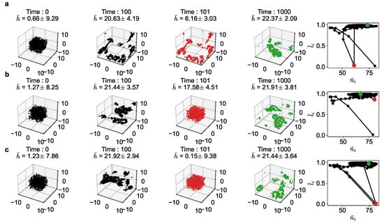 As seen in Figure 5, after the 100th time-step, when the population had reached equilibrium, we introduced these disturbances. The 101st time-step shows in red color the new far-from equilibrium states, where the average utility (h) has dropped considerably. In all cases, the population recovers quickly, typically in another 100 time-steps or so, to reach the original equilibrium region (shown in green). The figure shows the disturbance (red) and recovery (green) in both the 3D space and the phase space.