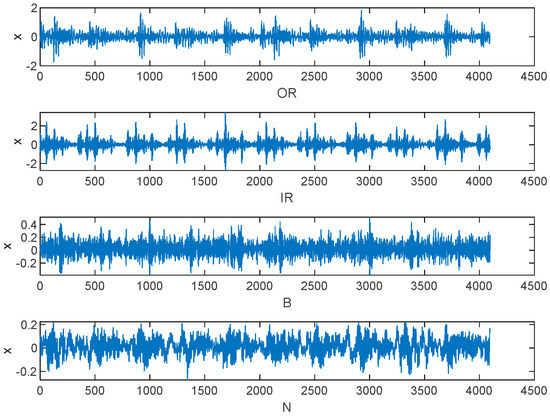 Step 1: We selected vibration signal data for four states (inner ring failure (IR), outer ring failure (OR), rolling element failure (B), and normal (N)) based on the characteristics of the rolling bearing test bench data from Case Western Reserve University in the United States.