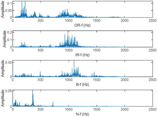Rolling bearings inevitably produce vibrations in both normal and faulty states. The fault signals of bearings manifest as periodic impact signals, where the occurrence of faults is reflected in changes in the frequency and amplitude of the original signal. The spectrograms of the four state signals are shown in the Figure 6. By analyzing the impulsiveness and cyclostationarity, we can gain insights into the presence of faults, anomalies, or disturbances in a system, aiding in diagnosis, prognosis, and decision-making for maintenance or corrective actions. Hence, based on the impulsiveness and gyroscopic stability of bearing vibration signals, Qing Ni et al. [2] proposed a new bearing prognosis scheme. These characteristics of bearing signals align well with the advantages of entropy calculation in statistical analysis. In addition, impulsiveness is also a valid bearing failure feature [26].