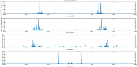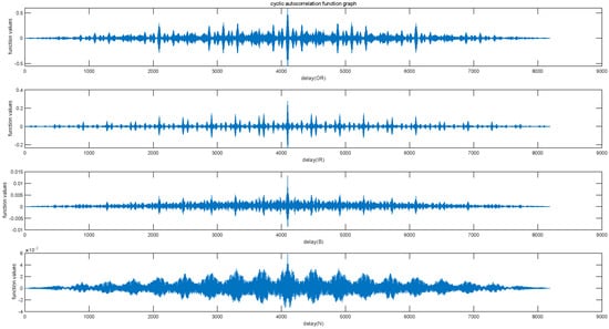 Cyclostationarity refers to the property of a signal where statistical properties exhibit periodic variations over time. The vibration signals of rolling bearings have periodic changes over time, and this change itself is also periodic, resulting in the generation of cyclic stability. In cyclostationary analysis, the focus is on studying the cyclostationary features of a signal, such as cyclic autocorrelation (see Figure 7) and cyclic power spectral density (see Figure 8).
