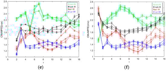 MPFE, CMPFE, MvMPFE (var), MvMPFE (rms), CMvMPFE (var), and CMvMPFE (rms) values of sample data: (a) MPFE; (b) CMPFE; (c) MvMPFE (var); (d) MvMPFE (rms); (e) CMvMPFE (var); (f) CMvMPFE (rms).