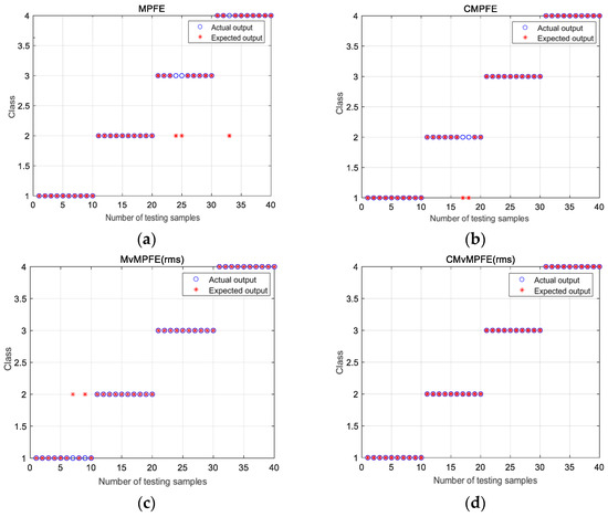 Based on Figure 10, it can be inferred that the recognition accuracies of the four models are 92.5%, 95%, 95%, and 100%, respectively. Similarly, CMvMPFE (rms) achieves the highest accuracy among the four models, as shown in Table 1.
